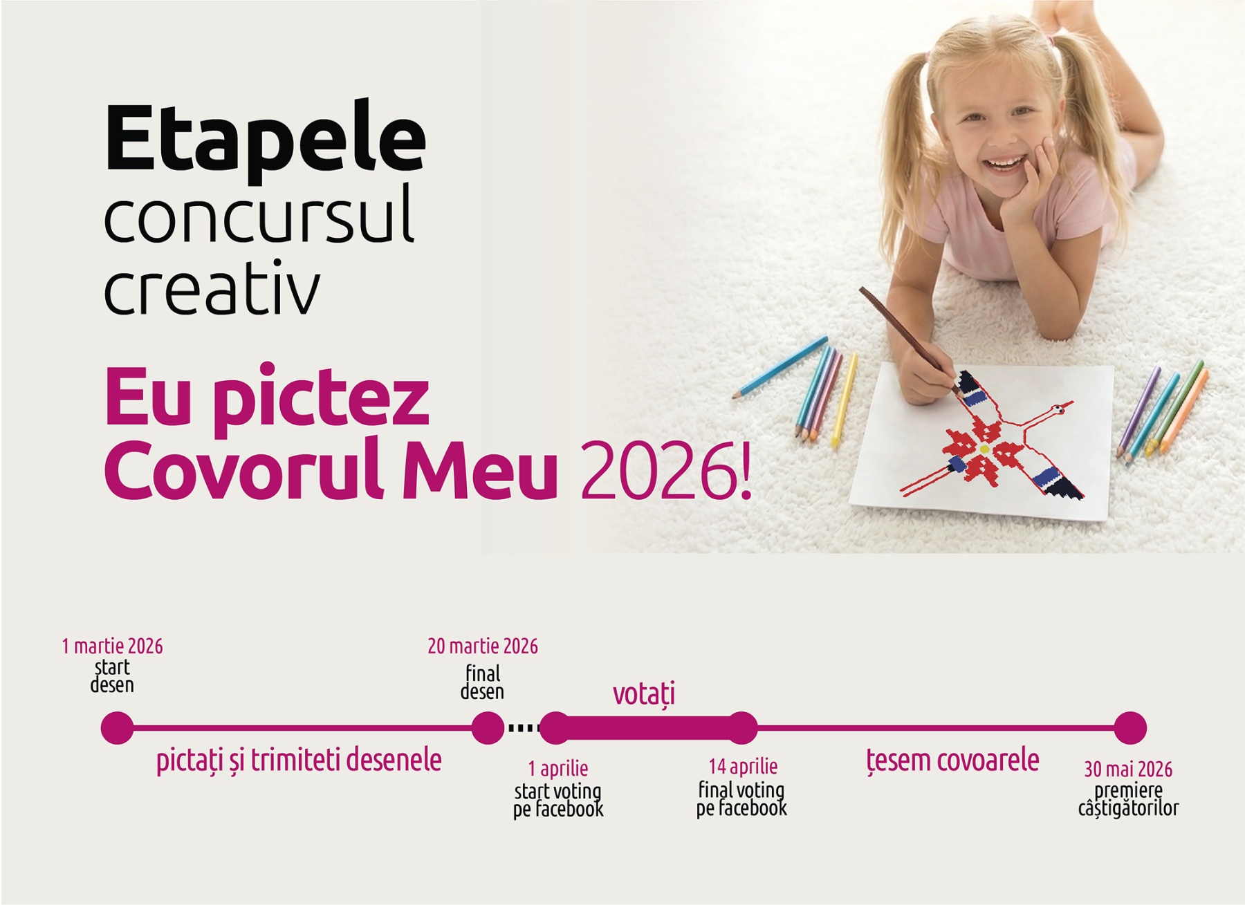 🎁 Câștigătorii vor fi premiați pe 30 mai 2026 în cadrul unei mari sărbători — oferim premianților covoare personalizate, țesute după desenul lor!